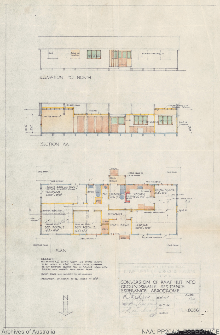 Works on the preparation of the RAAF’s “Advanced Operational Base” or “AOB” in Esperance began almost immediately thereafter in 1940. Surveying, clearing, cross-ploughing, seeding, levelling and fencing were all completed under three separate contracts in 1940, and "extremely urgent" RAAF buildings; wireless telegraphy receiving station, wireless telegraphy transmitting station, sleeping quarters and mess, earth closets et al, were all erected in a tight deadline between December, 1940 and January 1941 by contractor Jack Flett. Three machine gun emplacements, one of which is still in place today, were then constructed in 1942 under contract, two by Cyril Wildy and one by Ern Hodges, along with a handful of other RAAF buildings, including, among others, barracks, pyrotechnic stores and bomb dumps. A Home Guard unit was placed in charge of the new Esperance Aerodrome, "...where there were sheds full of bombs and stacks of 44 gallon drums of aviation fuel".
